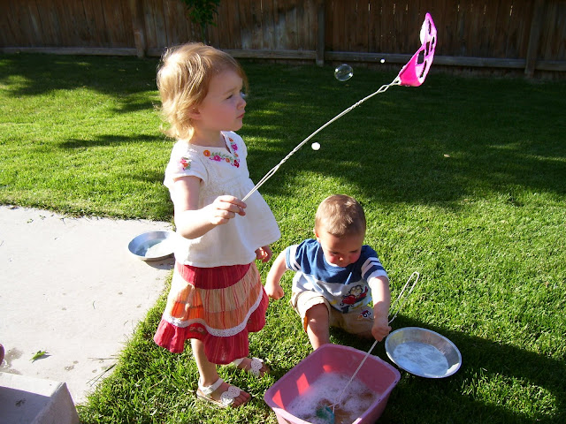 Combine water and joy. Cut a few squares out of the fly swatters. Poor bubble mixture into shallow bowls (she uses pie tins). Dip fly swatters into mixture and watch the bubbles fly.